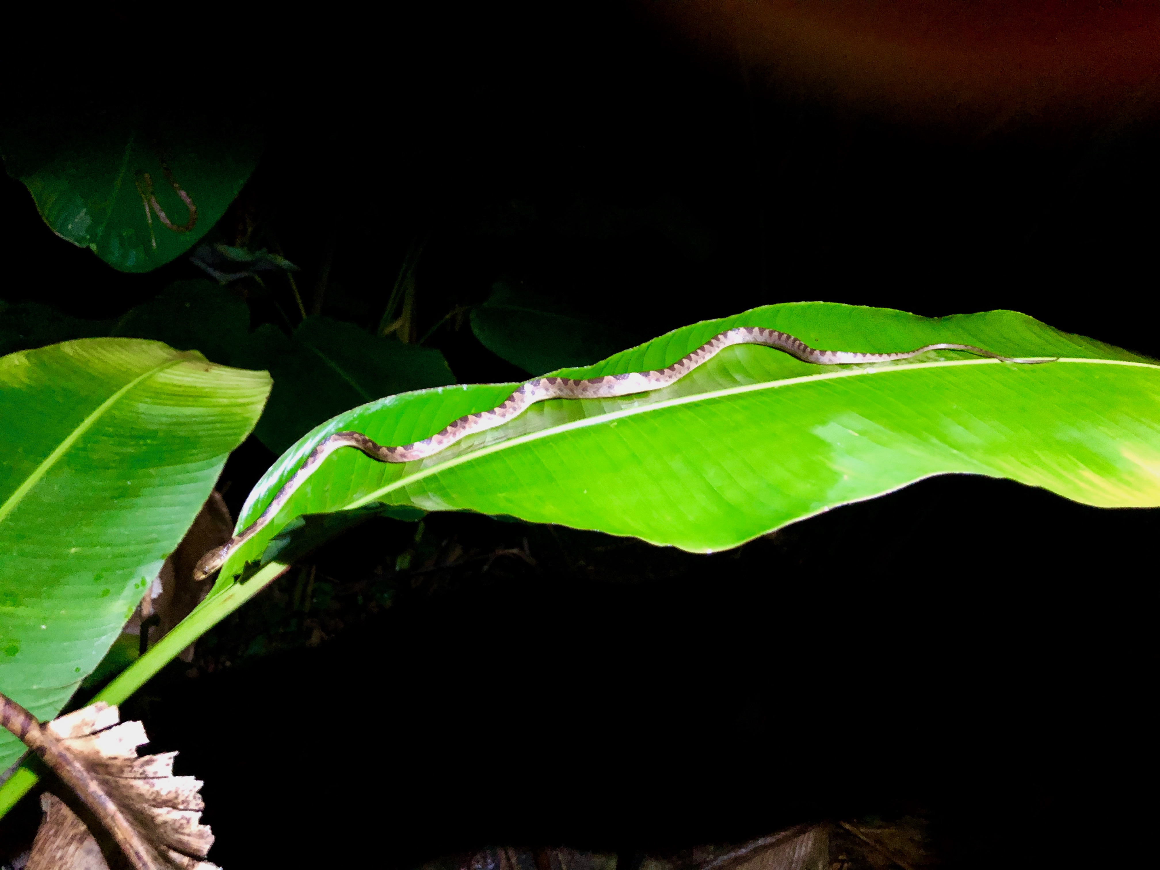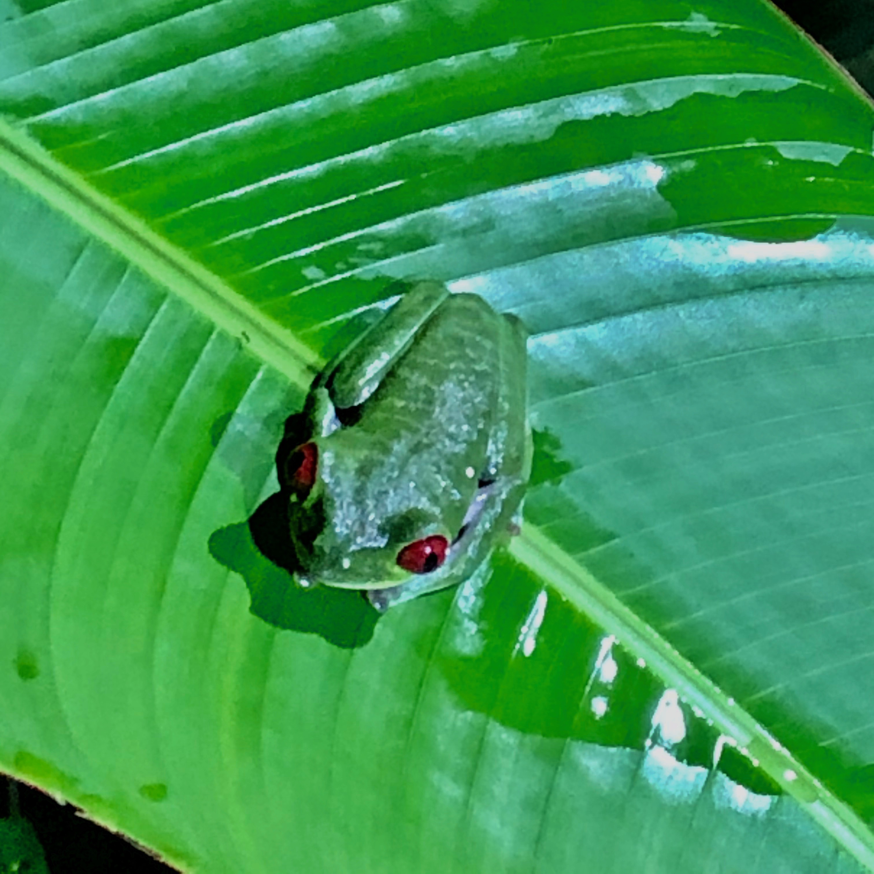 On an unassuming, scarcely visible, trail we went on a nighttime hike in the jungle with a biologist last night. Four of us. It is as the movies show: strange creatures lurking everywhere. Among the thick vegetation from the ground up were motionless creatures that remained motionless while we examined them with lights from our iphones and weak flashlights. I doubt that any of them remained motionless when a cricket, cockroach, or red-eyed frog ventured by. At our moments though they seemed to peer at us while we peered at them. Reciprocity? Fairness?