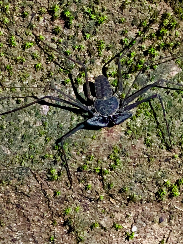 The Wandering Spiders seemed way too common for comfort. No web. They aggressively attack and bite their victim while injecting a paralyzing venom. On humans it is reportedly painful and leads to ugly skin necrosis at the bite. The good news: not fatal to humans. On leaves, under leaves, overhead, and ankle high, fortunately their view seems to be: why waste our good juices on those ugly giants?