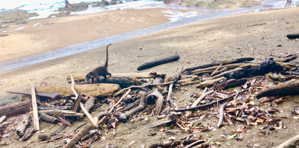 Today with some regret we left Aguila de Osa Lodge on Drake Bay (check it out on the web and you’ll see why) and made our way through the vast mangroves by outboard motorboat to the car and on to Uvita. It is only the beginning of the rainy season here but the downpour, thunder, and lightning are sobering… what lies ahead when the real rain starts? We got a swim in (water warmer than the air) only minutes before the drama began. Drumming on the roof of our “suite” is all but deafening.