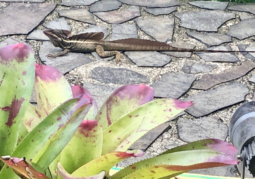 One could shout “Jesus Christ!”. We didn’t but the Jesus Christ lizard was, like its neighbors, similarly subdued. We have all probably seen the videos of these critters skittering across water on their flying feet, appearing in our dimension of time to walk on water. Never seen one lying on a palm frond just eyeing us.