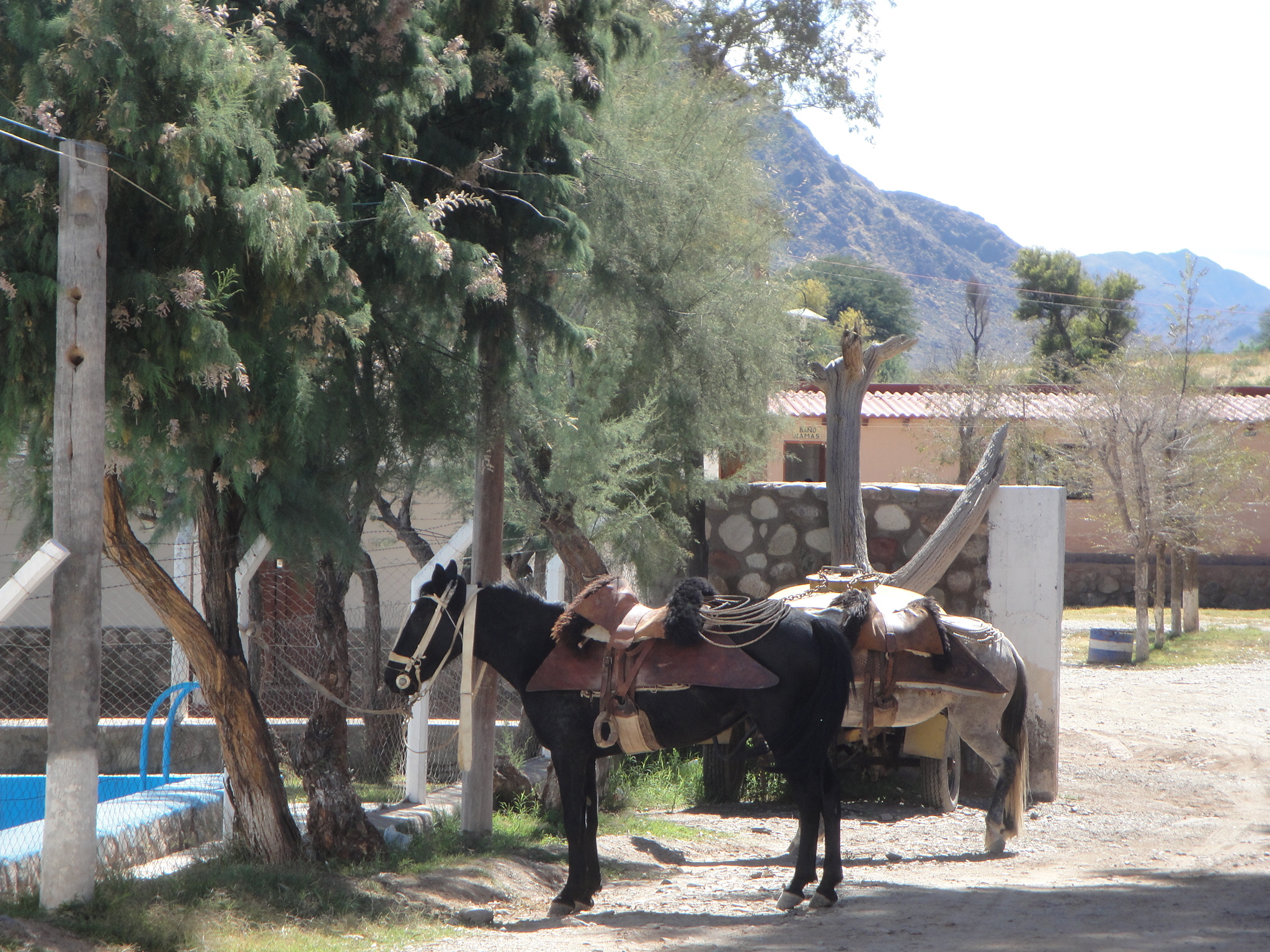 THE SMELL OF WINE IS HEAVY IN THE AIR..we are in Cafayate about three hours south west of Salta in the North West corner of Argentina. This is the second most important wine region, Mendoza being the first. We have traveled here from Salta with our guide and the journey was absolutely stunning. The hotel we are staying at is called Patios de Cafayate, and the vineyards surround us as well as the machinery to create numerous bottles of wine. The hotel is old and graceful and yet another former home of a family who has since moved on. As I walk out to the gardens the aroma hits me. It is a familiar smell of wine, but the smell I prefer is of the new mown grass and all the images that this projects. The weather is warm and sunny and it is nice to feel the heat on my bones after Ushuaia! Guy and I constantly remind each other that we should not compare one place to another but I have been overwhelmed by the similarity of this town to Sonoma in California. The “plaza” along with the buildings, artisan shops, cafes and restaurants around the square give me a feeling of being in another place which is quite strange. Each place of beauty should be unique and of course they are but the “Spanish” influence that we are constantly experiencing is similar in so many of the places we have visited that it is very easy to make comparisons. Comparison also makes looking for that something different a bit of a challenge. So much of what is on sale here comes from Peru and Bolivia and we constantly say “ oh there is that shawl we saw in such and such a place” Truck loads of goods come to Argentina daily, (all trains were taken out of service in 1982 when the president came under pressure from the Truckers Union to disband all services) and the goods are distributed around the small villages to be sold in the markets. We were taken by our guide to some shops that only sell original goods and so as a result we now have some original Argentinian items to enjoy and give as xmas presents. Another comparison that I make is the similarity to Ireland in one respect. The amount of horses around here. Every field, shed, front and back garden, and of course miles of roadside grazing are available to tie your horse up in. I have only seen one animal that was a bit underweight otherwise they all look strong and in good condition. On the way to Molinas we saw a horse in the middle of an enormous area of land tied up, fully tacked and with no gaucho in sight, eventually Guy said “there he is” and right in the middle of a herd of cows the gaucho was calmly checking things out. The horse meanwhile just waited for his master to return. Certainly in some of the small villages we passed through horses were tied up, again saddles and bridles on just waiting, no attempt being made to escape, what patient creatures they are, and how I am enjoying seeing all of them. Guides are people that we do tend to compare. One incredible thing that they have all had in common (at this point we have had fourteen) is their ability to talk non-stop! Some speak excellent English and others have a mixture of words that they favour so after a few hours those words that they do favour become somewhat annoying. We have found that by the end of some outings (we have had all private tours) that our heads are swimming with statistics and we cant take it all in. I have been really interested in the “story” of how our guides have ended up with that role in life. Many have spent a number of years in training and have been at it a long time and some are in the locations they have chosen because of family or a loved one. I have to say that I really respect them for their enthusiasm and dedication. Buenos Aires and a week in an apartment in Recoleta is our next port of call. I spent two months there five years ago and will be interested to see if things have changed….. Posted on April 24, 2012 by thebunguycord Reply