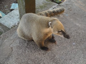 And so we had a day by the pool at the Hotel das Cataratas. We arrived at the pool at lunchtime (with no intention other than to rest under the sun umbrella) but first we thought we might try a little lunch. A delicious smoked salmon bagel arrived which we cut in half (neither of us were feeling very hungry). Just as I was enjoying my second mouthful I saw scuttling past my feet at the rate of knots a furry creature, no sooner had I opened my mouth to tell Guy what I had seen when suddenly there it was on the table snatching the salmon and causing chaos to the condiments on the table which then smashed on the floor, this was our introduction to the “coatis”. Hell bent on getting as much food and as quickly as possible these creatures, not unlike raccoons, sit and wait until innocent people like us are about to savour the delights of a simple smoked salmon bagel! A few minutes later it also landed in the middle of the table of the English couple sitting next to us stealing a bowl full of nuts. I cant remember ever having seen a woman move from her chair so quickly and hide behind her (rather large) husband for protection.