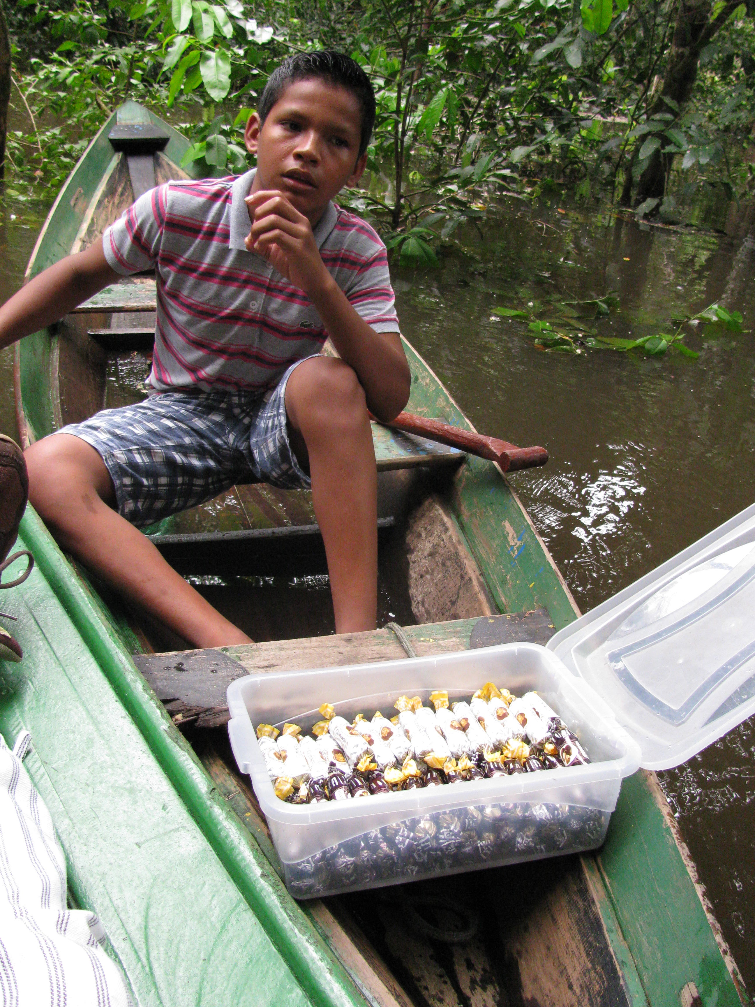 Location, location, location–in the middle of the flooded jungle somewhere out there is this true entrepreneur selling chocolates when he is not too busy bailing out the water in his leaky canoe. One of our party had been lamenting that she had not bought any Brazilian chocolate–she stocked up here and made his day. Posted on May 13, 2012 by thebunguycord Reply