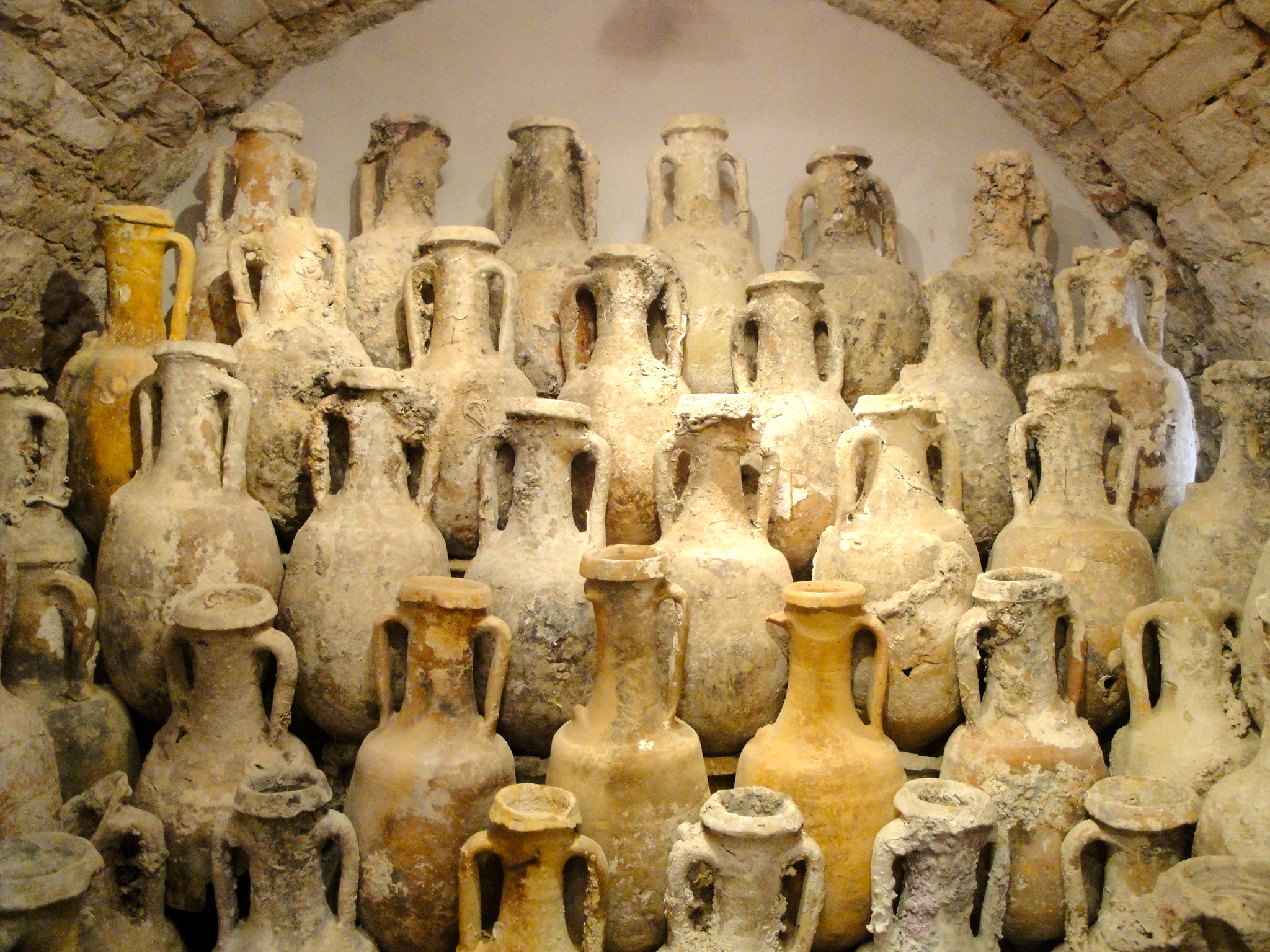 Only SOME of the amphora recovered in 1971 from a wreck off Vis estimated to have occurred about 1800 years ago. Arranged more or less as they think the amphora would have been stacked on the original 50 foot boat. Posted on June 18, 2012 by thebunguycord Reply