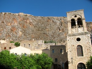 A church in center “Lower Town” in Monemvasia where you can see the fortress walls in Upper Town originally built to hide, then expanded by Romans, then Venicians, etc., as each sought to control this passage through the Sea. Posted on July 14, 2012 by thebunguycord Reply