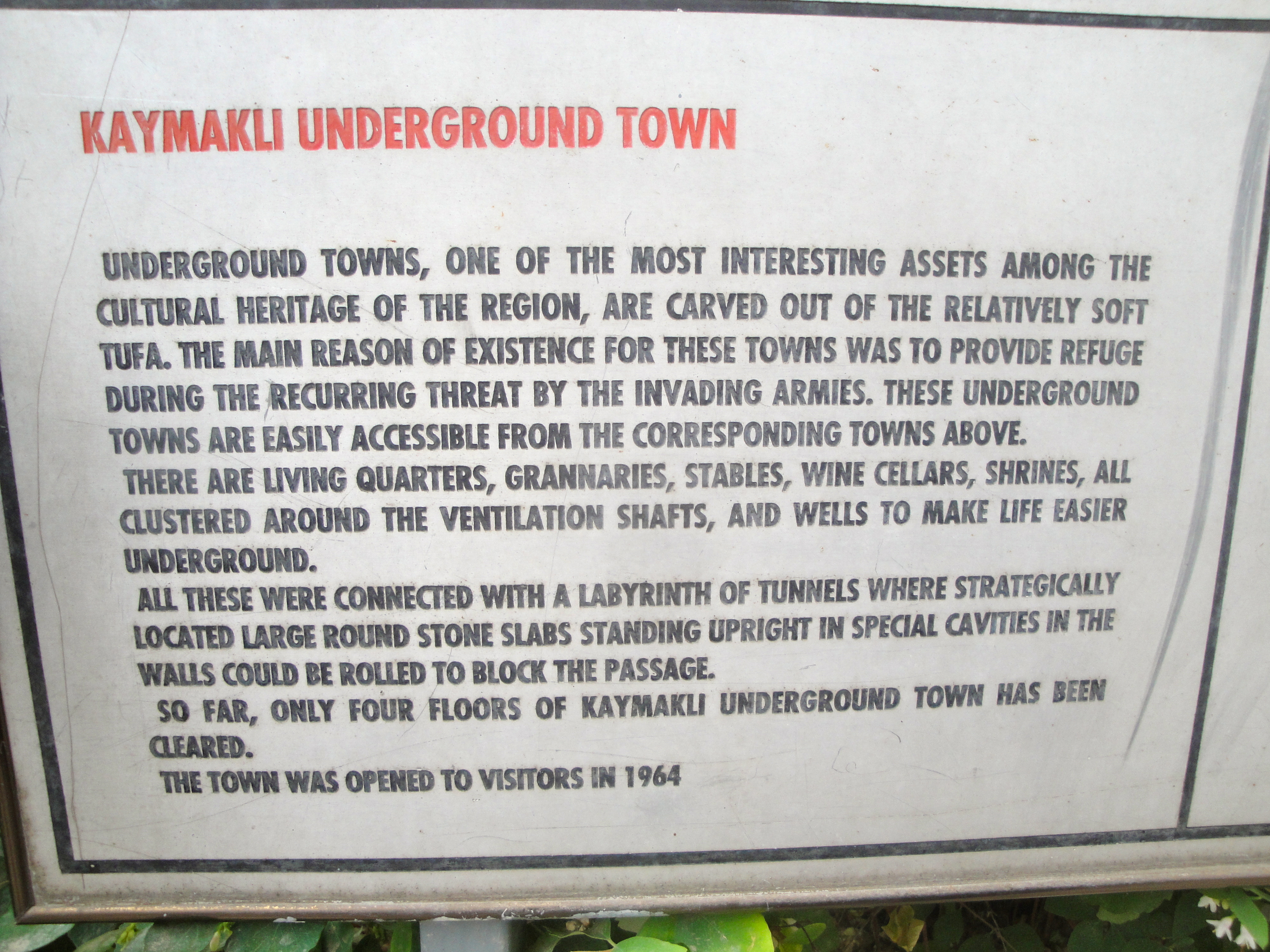 Kaymakli underground city described. A vast network of caves, smaller than Derinkuyu but with larger rooms. Posted on August 9, 2012 by thebunguycord Share this: Share on X (Opens in new window) X Share on Facebook (Opens in new window) Facebook Like Loading... Related