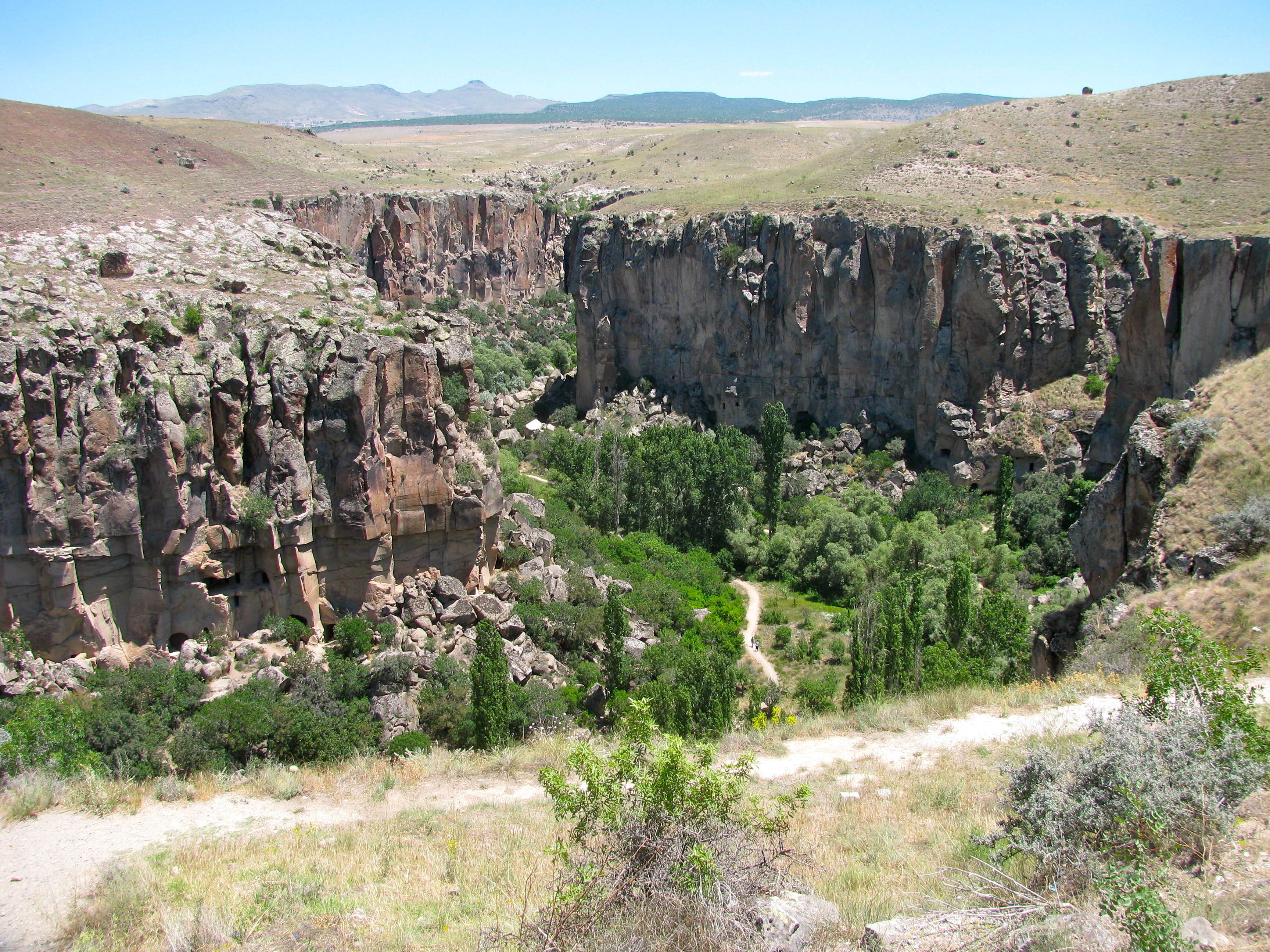Looking down into the Ihlara Valley where there are hundreds of cave dwellings and several “churches”. We hiked down to see them and had a picnic along the stream at the bottom. It is thought that the original inhabitants moved down into this valley for protection from the numerous invading armies. The stream at the bottom also provided a steady water supply to grow crops and feed livestock. As you can see, the land outside the canyon is arid with little water and little opportunity for either farming or hiding from enemies.
