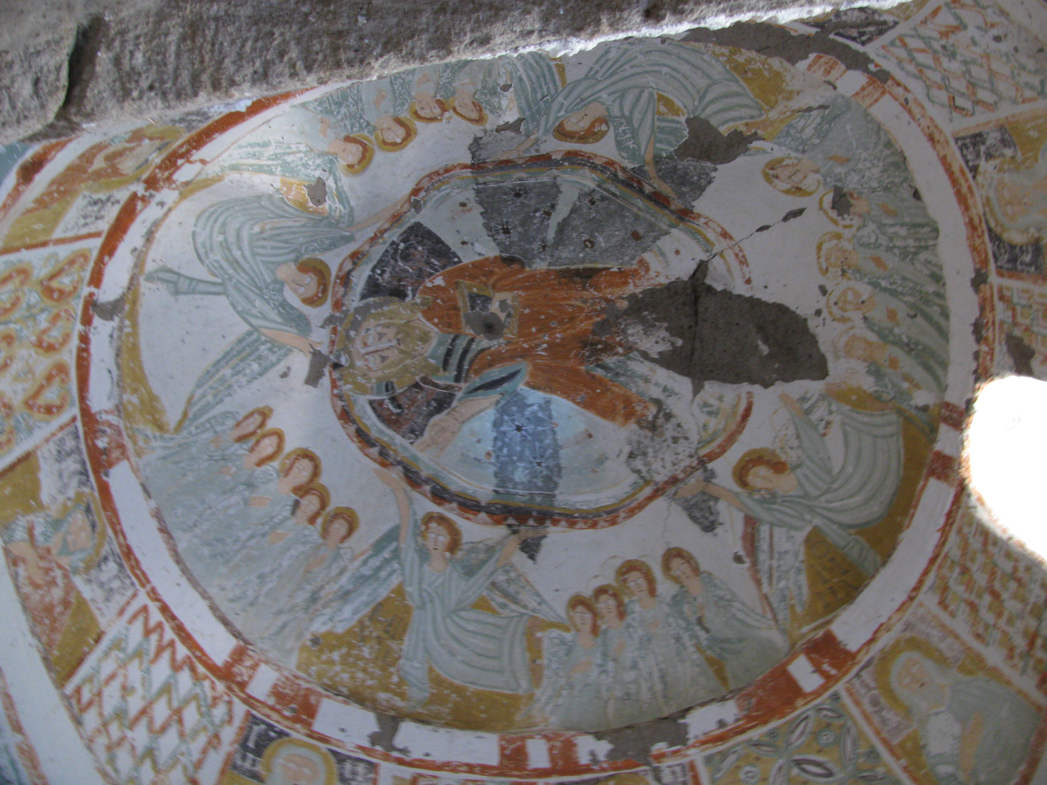 The ceiling in the Agacalti church. Notice the ancient frescos marked over by icons and other items in an unsuccessful effort to remove the Christian references. Posted on August 10, 2012 by thebunguycord Share this: Share on X (Opens in new window) X Share on Facebook (Opens in new window) Facebook Like Loading... Related