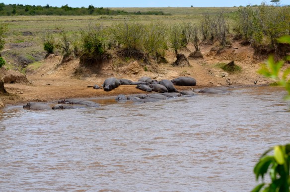 A bank full of hippos at the Crossing. Why do they gather here where the wildebeest cross and where dozens of monster crocs wait patiently for their feast? Major enemies. I read an account where a hippo rescued a wildebeest calf as it struggled in the current…. As crocs circled to catch the weakening calf, a hippo emerged from the froth of water to use its nose to push the calf onto the bank. Once rescued, the same hippo once again returned to the frothy water, chock a block with wildebeest, zebra, and hungry crocs and, rather than get out of the fray, instead entered the fray. A young zebra was now floundering. The hippo again used its nose to push the zebra calf onto a rock outcropping on the shore. Compassion? Emotions on the part of the hippo? Snubbing its nose at its arch-rival enemy the crocodile?