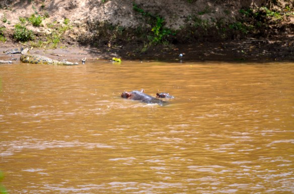 A Hippo cow with her calf at her side having a stare down with a not-so-hungry croc… no love lost between these co-habitants of the “Crossing”… Image Posted on October 4, 2012 by thebunguycord Share this: Share on X (Opens in new window) X Share on Facebook (Opens in new window) Facebook Like Loading... Related