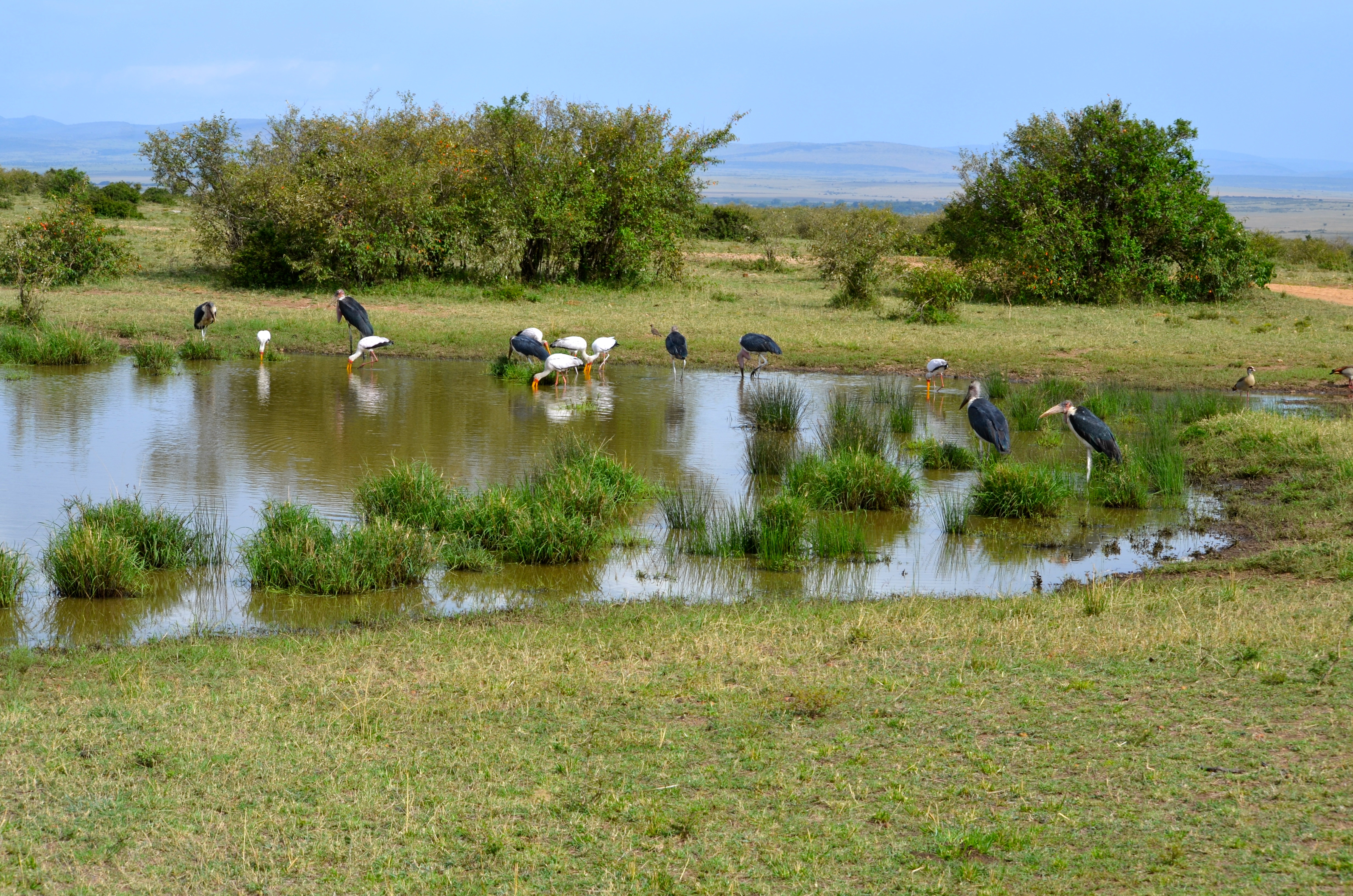 We came upon this pond in the middle of a very dry plain. Surrounded by all kinds of Egrets, Marabou, and others looking for—something!! Then, one of the smaller Marabou found a fairly good sized pond turtle (somehow it had survived this environment long enough to get this large). This began a 25-minute struggle between, ultimately, 3 of the Marabou and the turtle….. we were routing for the little guy…… what happened?
