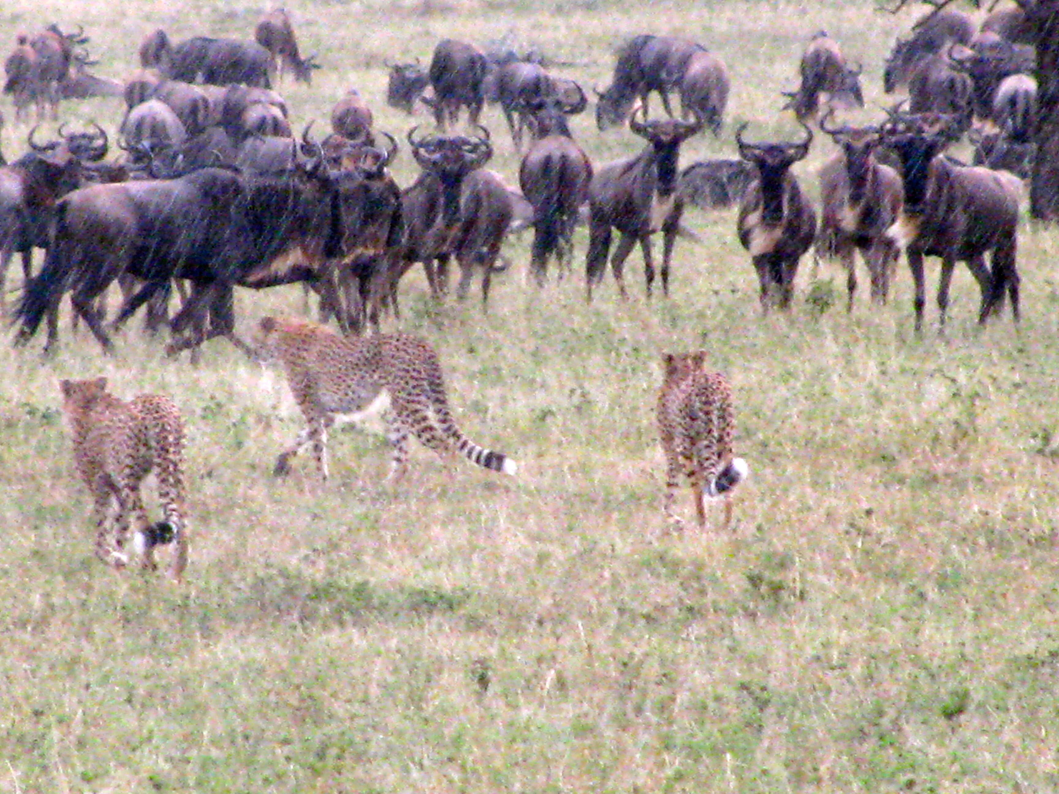 We came across a sea of clearly agitated wildebeest. After watching them for a few seconds we saw three cheetah brothers (as we found out) casually cruising through the herd. The sea of wildebeest parted ahead of the band of brothers. The brothers seemed in no hurry and the longer they strolled through the sea, the more agitated the wildebeest got…… and then ……