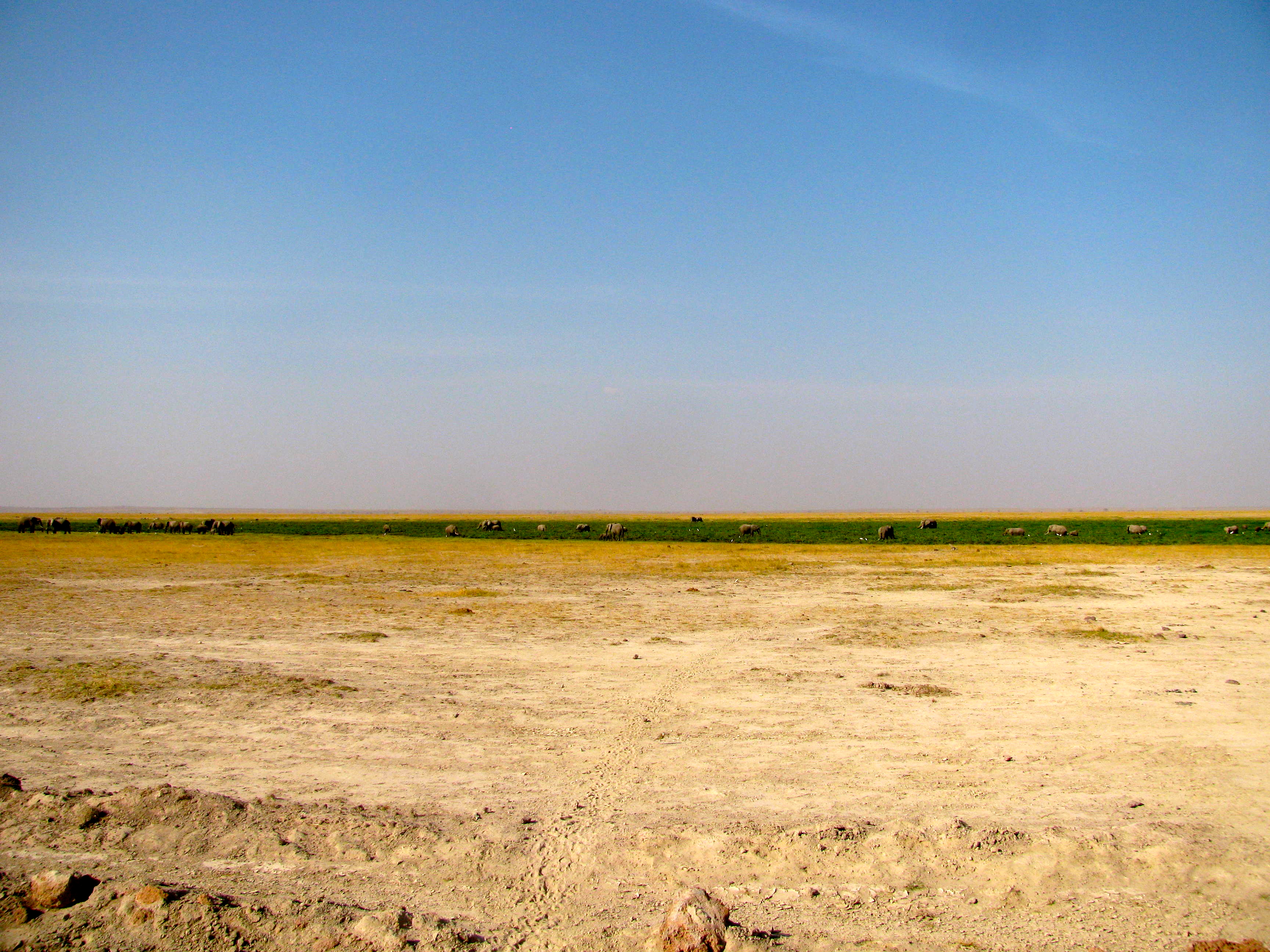 The vast plain…. Almost desert except for the swamp. To think that this was once filled with acacia trees that have now been completely stripped by the elephants brings home what over population of any species (including our own) ultimately means. Now the elephants (along with the hippos, antelope, birds, etc.) are essentially 100% dependent on this swamp (the thin green line in the middle)…..
