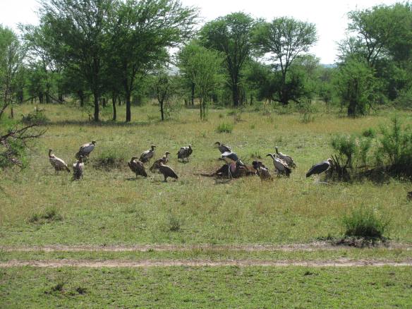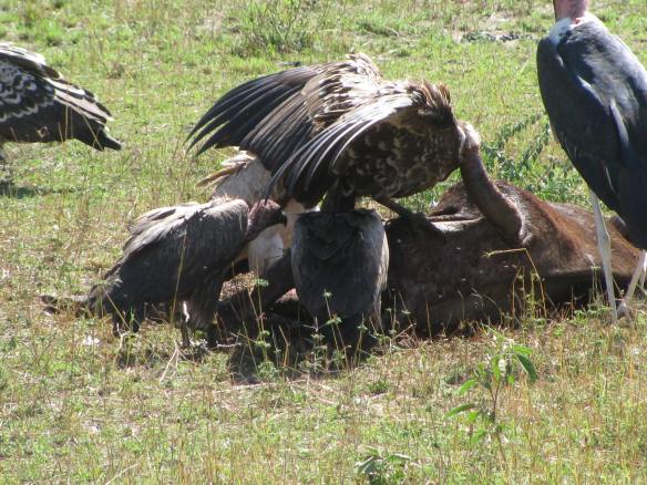 Vultures on a fresh kill….. it didn’t take them very long. Looks like it was a lion at first or a leopard that didn’t finish eating it…. These guys made pretty short work of it as they fought, screeched, and literally meat was flying in the air in the frenzy…. The Marabou stood on the sidelines getting the bits that were flying about and landing more or less at their feet.