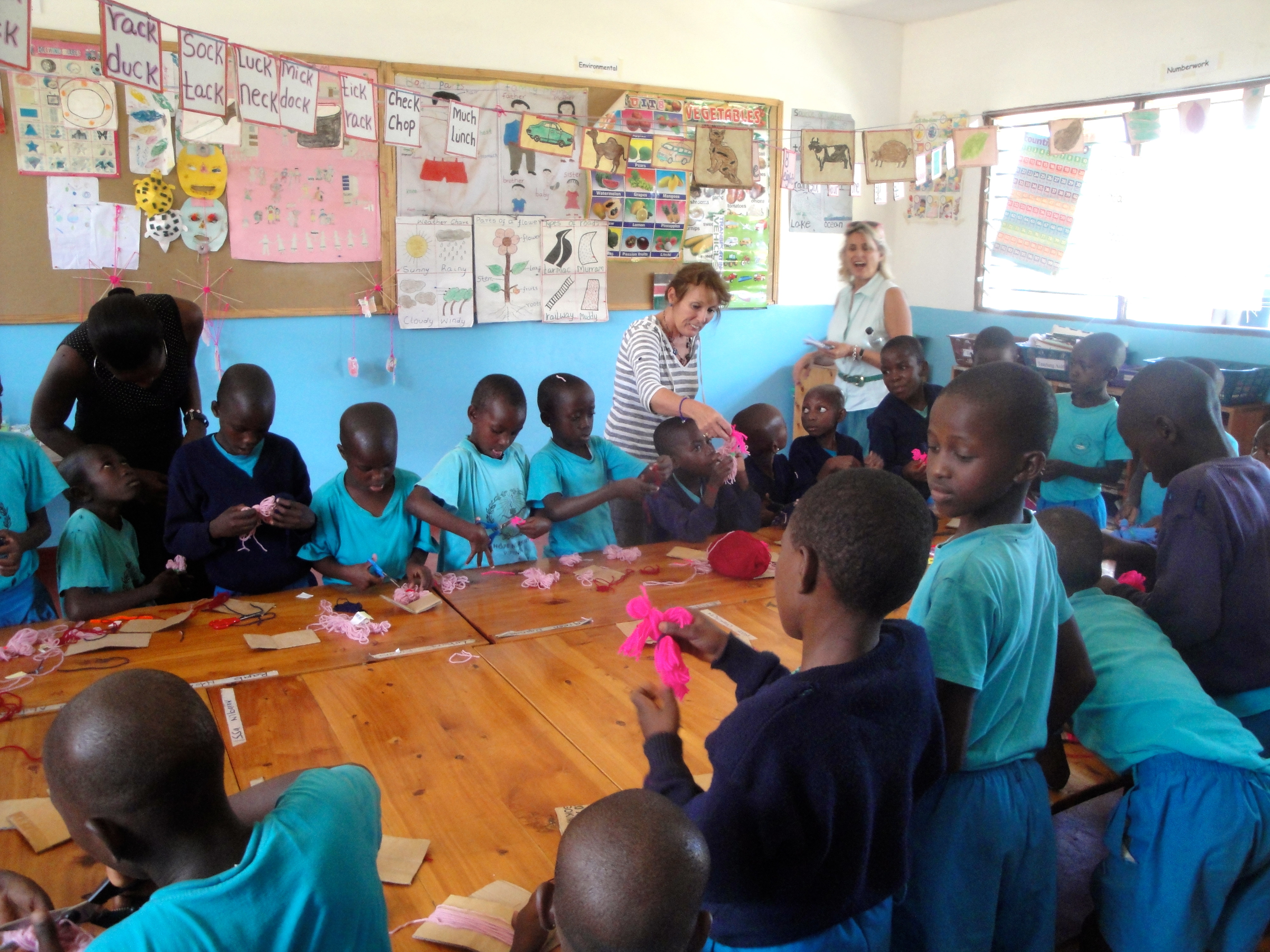 Bunny and Carol (the founder of Vipingo School) in the classroom watching the children busily making dolls which Bunny showed them how to do. Even the teachers were enjoying seeing the different colours and interpretations of the original doll…..the wool was donated by a company based in the UK. The school survives on donations and we can supply details upon request.