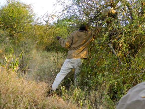Some of the bees build their hives on the OUTSIDE of the trees. The lobes of their honey cones are ready visible and accessible—vulnerable. Here Joseph is getting us some fresh—and utterly delicious—honey. The bees went after him and he ran through the bush for 100 meters or so until they left. We drove just 50 feet or so next to him so when the chase was over, he could get back in and provide us with the fruit of his efforts.