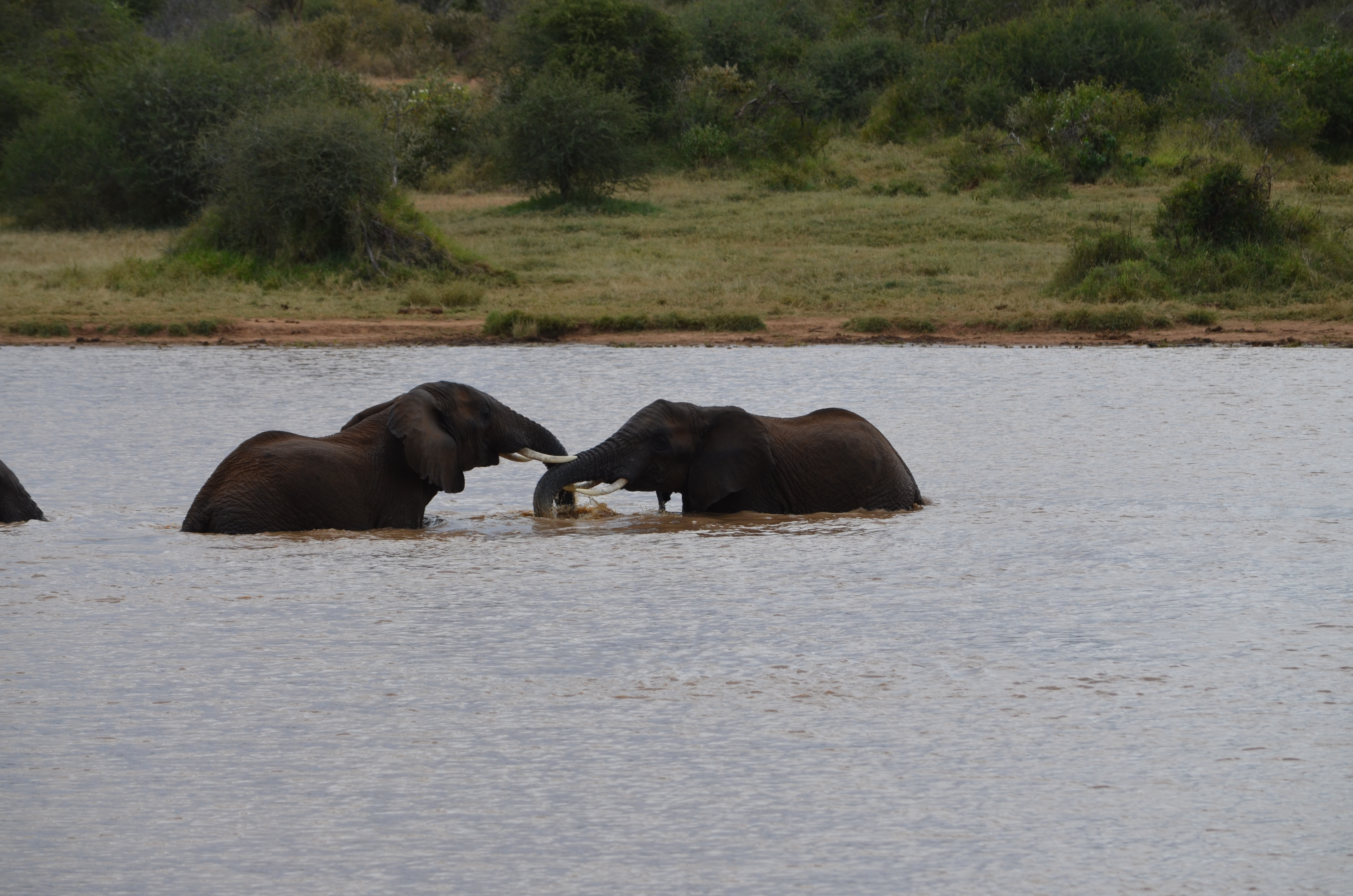 Every day we went to this small-ish pond to watch the elephants when they arrived and departed. In between they seemed to be having utterly unconstrained fun. Splashing and thrashing about, we were witnesses to a phenomenonal level of interaction, apparent caring, and early games preparing them for the challenges later in their adulthood. Anyone who suggests that there is nothing deeper to these (and other animals?) would have to have their eyes closed…… The next five slides are a series of these two at play. There were many of them in various acts of play. These two are presented as only an example….. they rough-housed, escalated, and ultimately ended with…. Well, watch the series.