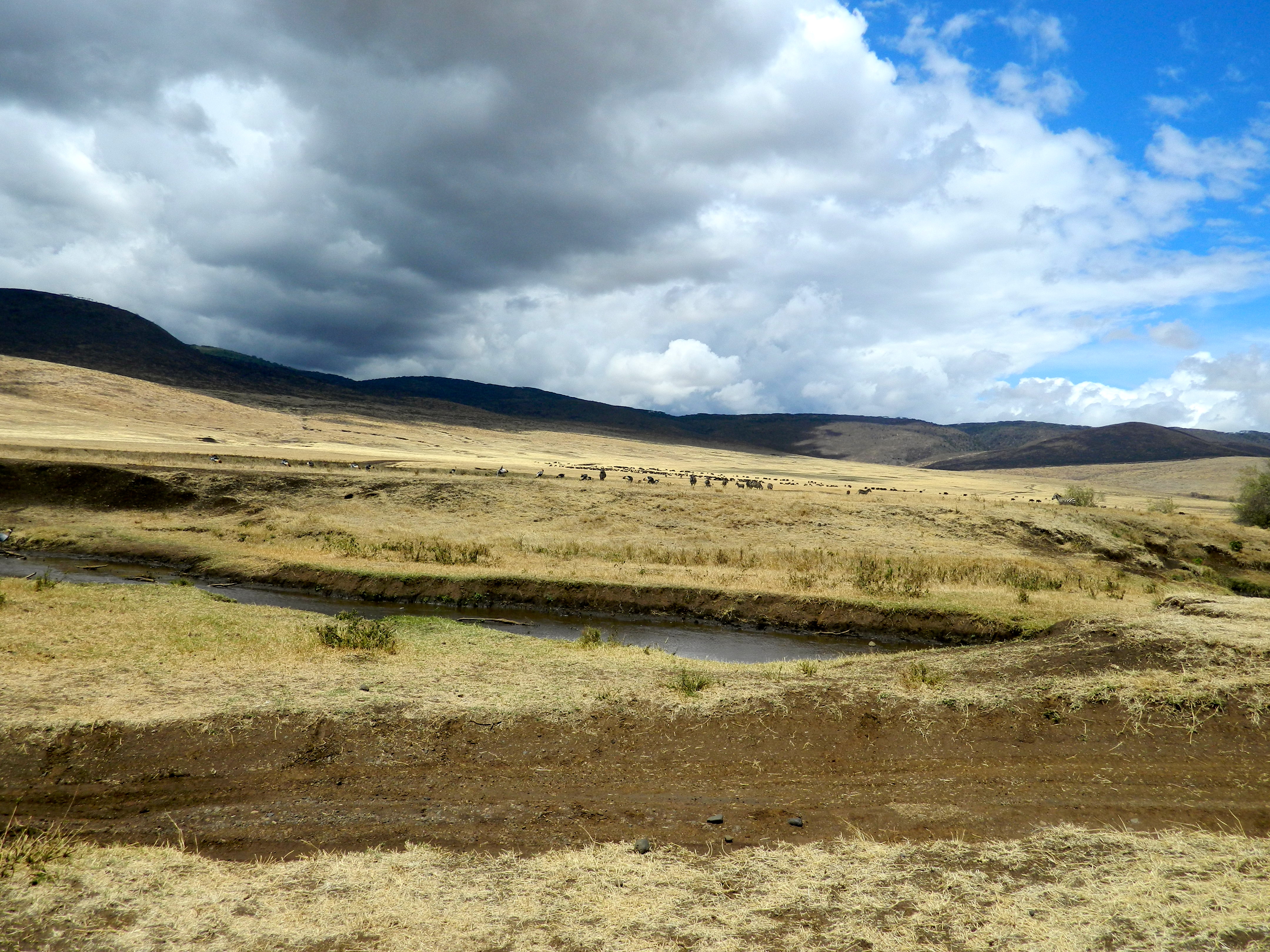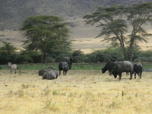 The bottom of the Ngorongoro Crater is almost flat. Visibility is good, making it harder for the predators. The comfort level of the critters—here buffalo, elephant, and zebra—shows, at least in daylight. Image Reply