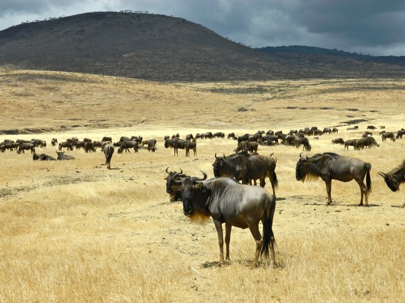 The wildebeest has a number of things that contribute to its amazing survival. Among them is the phenomenon that they all drop their calves within days of each other. With so many babies on the ground, the predators just cannot keep up. These are the same “black dots” visible from up on the rim of the crater. Image Reply