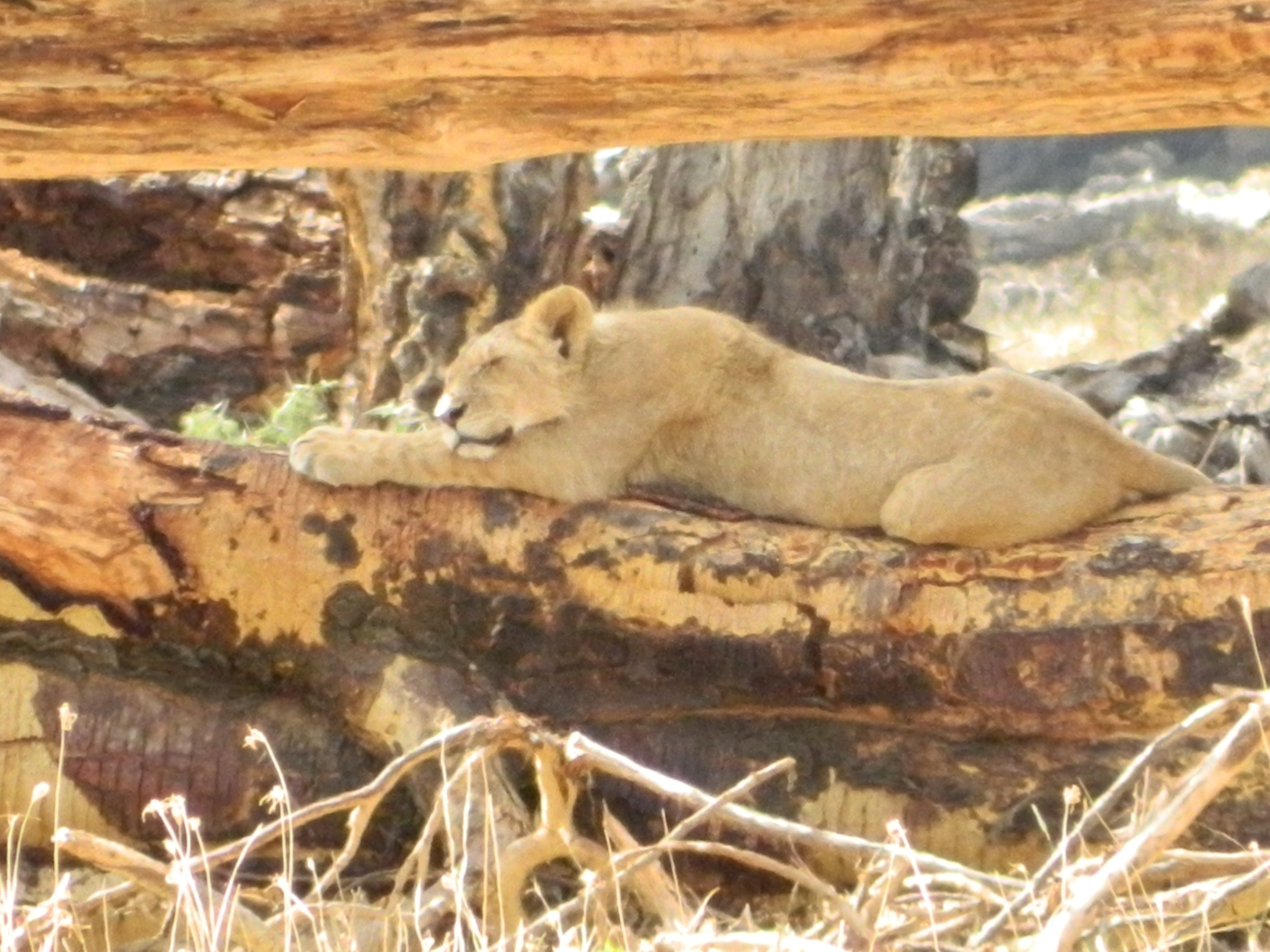 This cub is one of 3 cubs in a pride of 5 that were all hanging out on this fallen tree. Clearly pretty stressed out by our presence….. Image Reply
