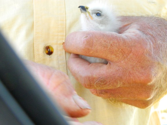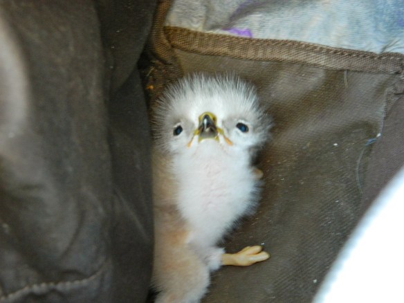 Peering out for the first time from the bag that Joseph put him into when retrieved from the nest….. Image Reply