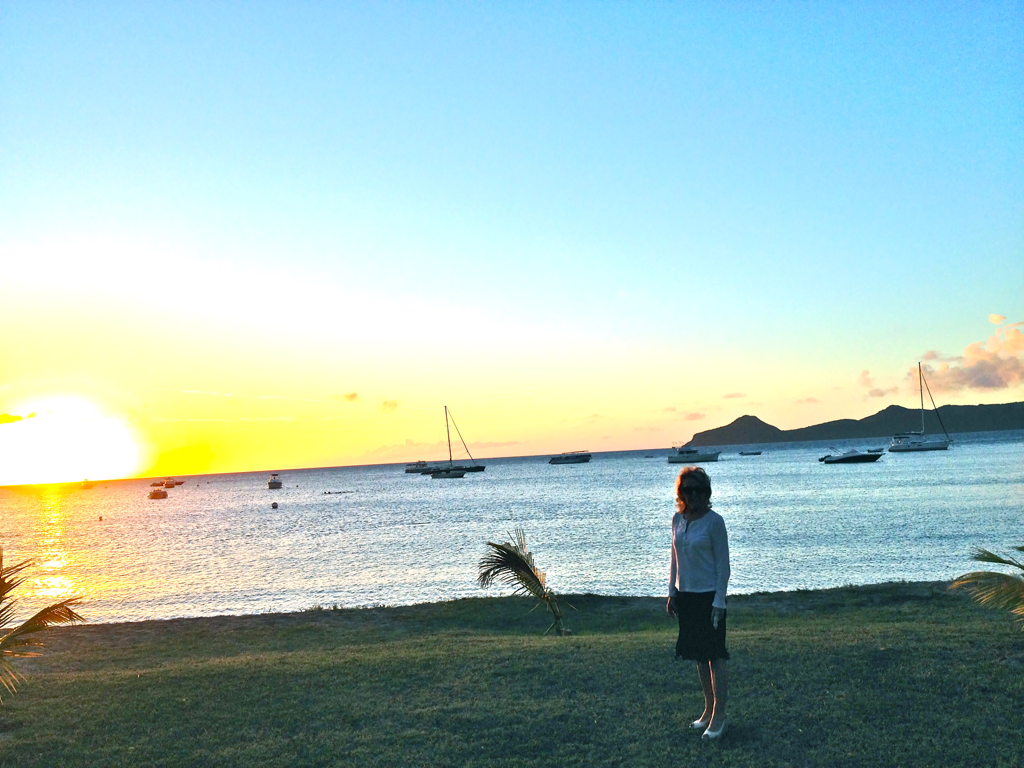 Bunny dressed up for dinner at the restaurant 150 feet down the beach. It actually happens! We witnessed it first hand. It isn’t just a myth. At sunset we witnessed the blazing greenish-blue flash that occurs at the horizon just as the sun splashes into the sea. It lasted about 1/10th of second but it was there. And it wasn’t just the rum punches in our hands.