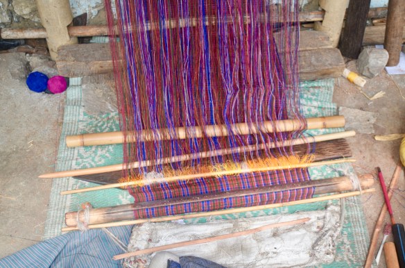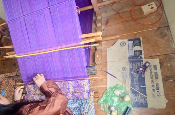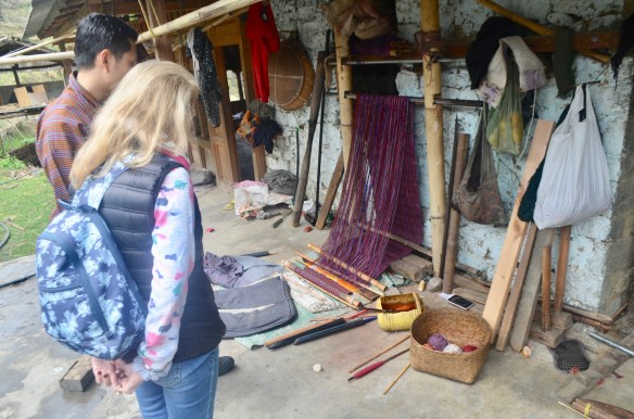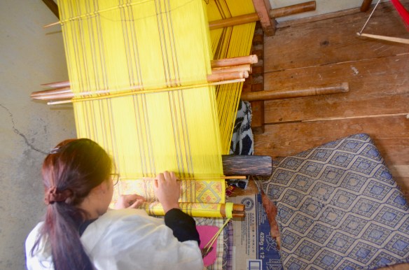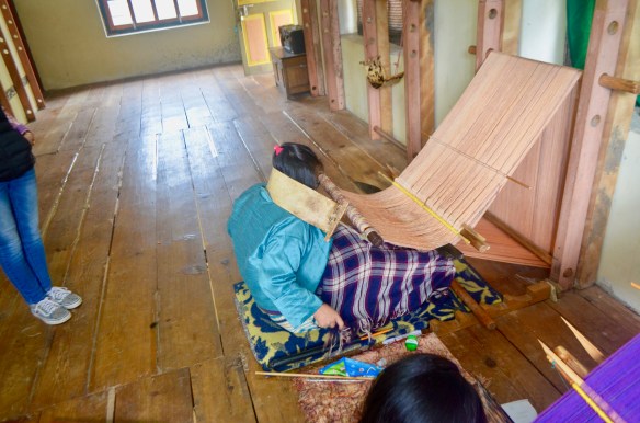 Ventures yesterday and today to temples, monasteries, nunneries, and the humblest of humblest of homes where people were weaving the most beautiful of garments in silk and cotton under impossible conditions. The photos will give you some flavor. Trundled downslope on a muddy path full of cow dung to arrive at the home of a woman weaver who was wonderful. We watched as she wove and talked about how she did it (all day when she is not tilling her fields or tending her cows), how long she has been doing it (since childhood), how long it takes to weave a shawl (3-4 weeks). Uphill from her were two more (mother and daughter of about 40) weaving in raw silk. They gather the cocoons, separate, treat, and die the silk. Only then can they begin the weaving. Same back-breaking weaving posture. We also bought several from the makers that added up to about 4 months of their income. There is something special about buying this stuff directly from the makers (that’s why our home is so full of “treasures”).