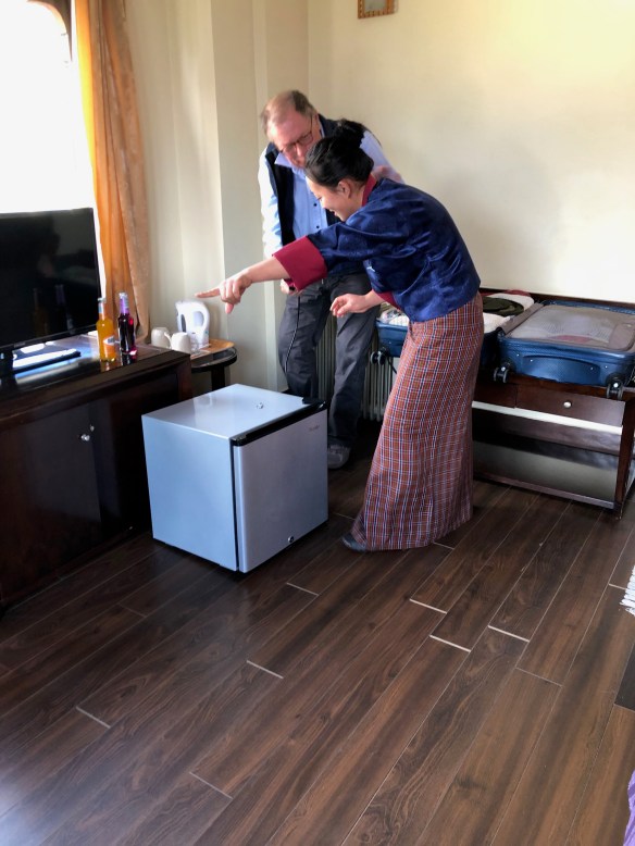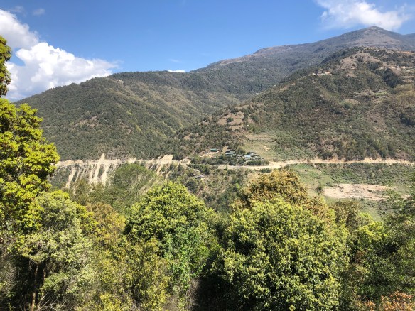 We started out at about sea level and have been climbing through the mountains all day—6 hours to go 120 miles. Rose to about 9,000 feet, settled for the next two nights at about 6,500 feet. The roads were advertised as “treacherous” and have met the challenge. Major road “improvements” are no doubt going to be improvements when finished but right now when looking straight up on one side of the road and straight down over a torn up already-bad road is, well, sobering. It took a while for it to sink in that part of what was so disconcerting was that I was sitting behind the passenger seat occupied by our guide, Phuntzo, and he kept turning around to talk to us. Fine. But, that is the seat that I would ordinarily expect to see the driver in…. while not conscious of it, my brain was warning me: “the driver is not looking where he is going” as we perch on a cliff into oblivion….. initially gut wrenching….. Of course, they drive on the wrong side of the road here. I knew that….