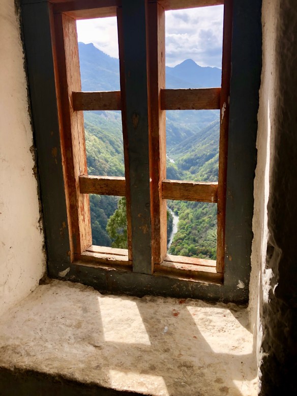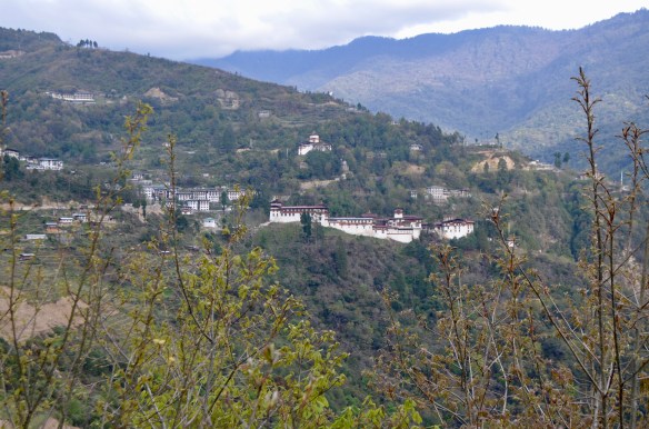 We started out at about sea level and have been climbing through the mountains all day—6 hours to go 120 miles. Rose to about 9,000 feet, settled for the next two nights at about 6,500 feet. The roads were advertised as “treacherous” and have met the challenge. Major road “improvements” are no doubt going to be improvements when finished but right now when looking straight up on one side of the road and straight down over a torn up already-bad road is, well, sobering. It took a while for it to sink in that part of what was so disconcerting was that I was sitting behind the passenger seat occupied by our guide, Phuntzo, and he kept turning around to talk to us. Fine. But, that is the seat that I would ordinarily expect to see the driver in…. while not conscious of it, my brain was warning me: “the driver is not looking where he is going” as we perch on a cliff into oblivion….. initially gut wrenching….. Of course, they drive on the wrong side of the road here. I knew that….